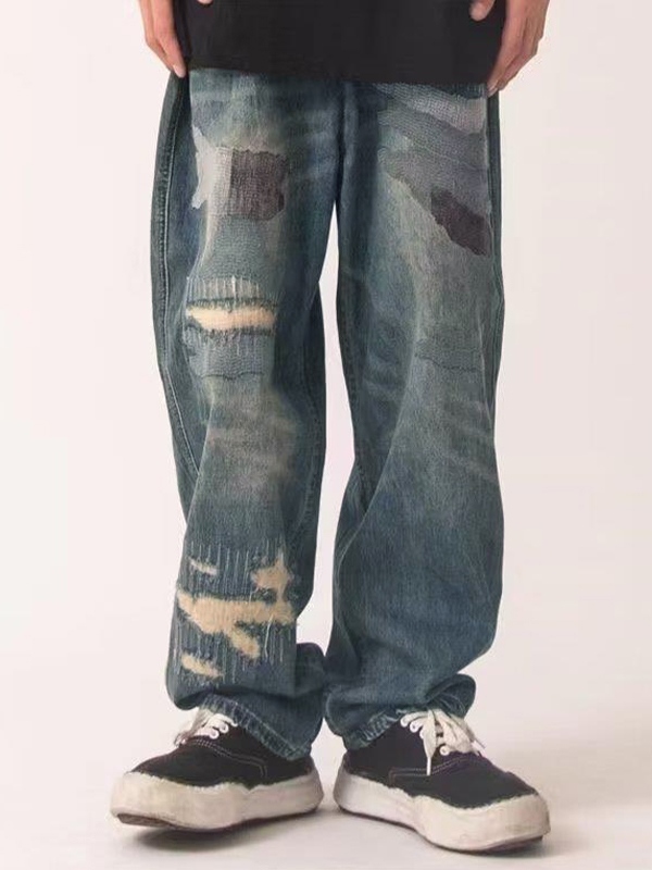 Jeans sueltos con decoración de varios parches desgastados para hombre