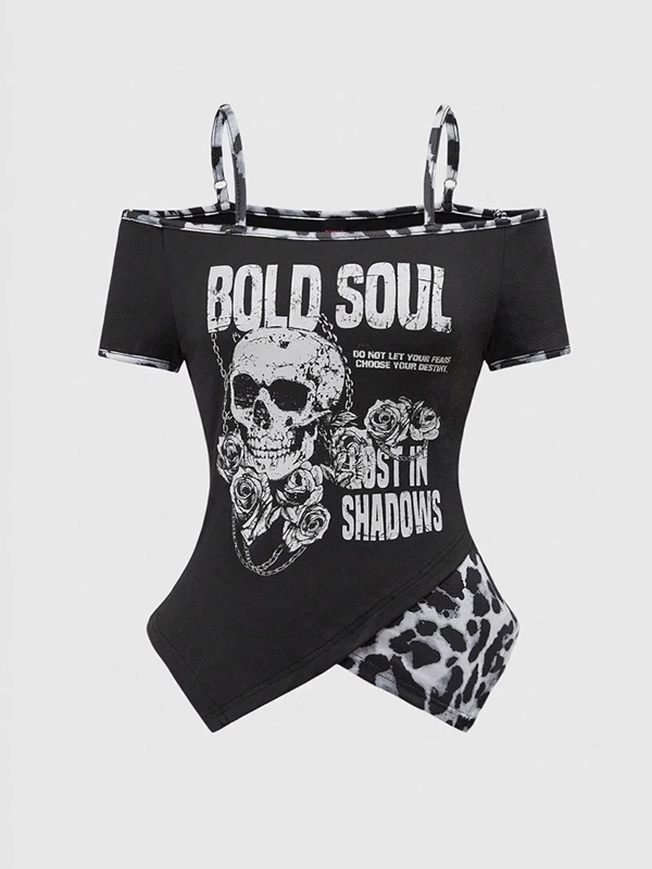Camiseta de manga corta con estampado de calavera de un solo hombro