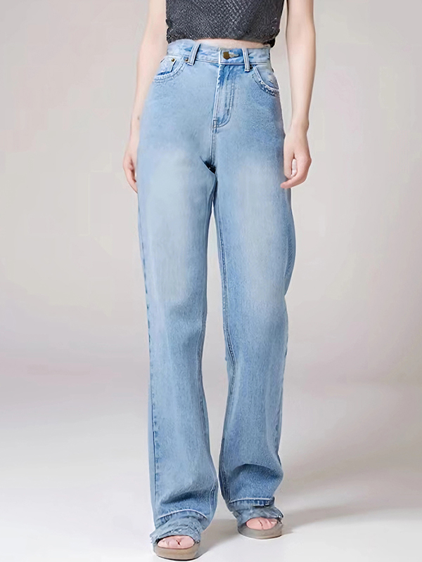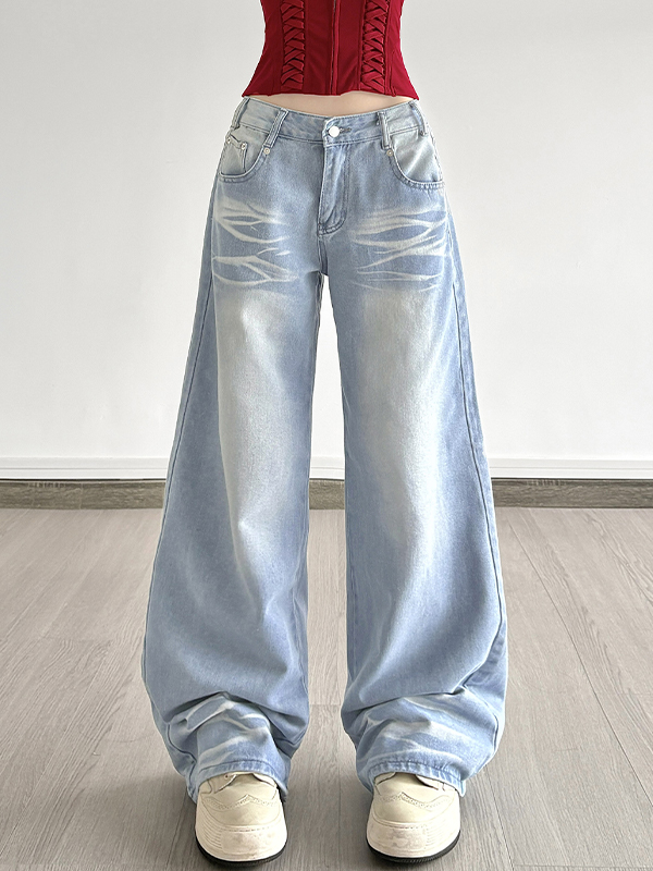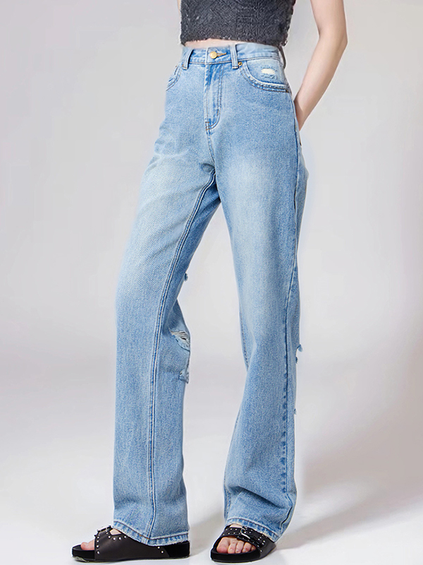 Vaqueros azul claro de cintura alta, holgados, con piernas anchas y rotos