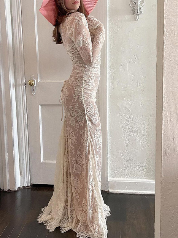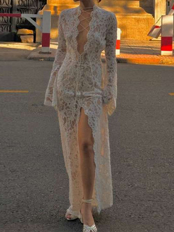 Escote en V profundo con abertura de tiras para vestidos largos ajustados