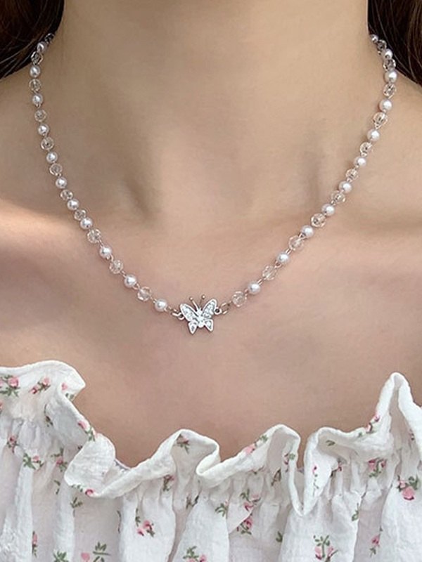 Collar de perlas de imitación de mariposa de diamantes de imitación